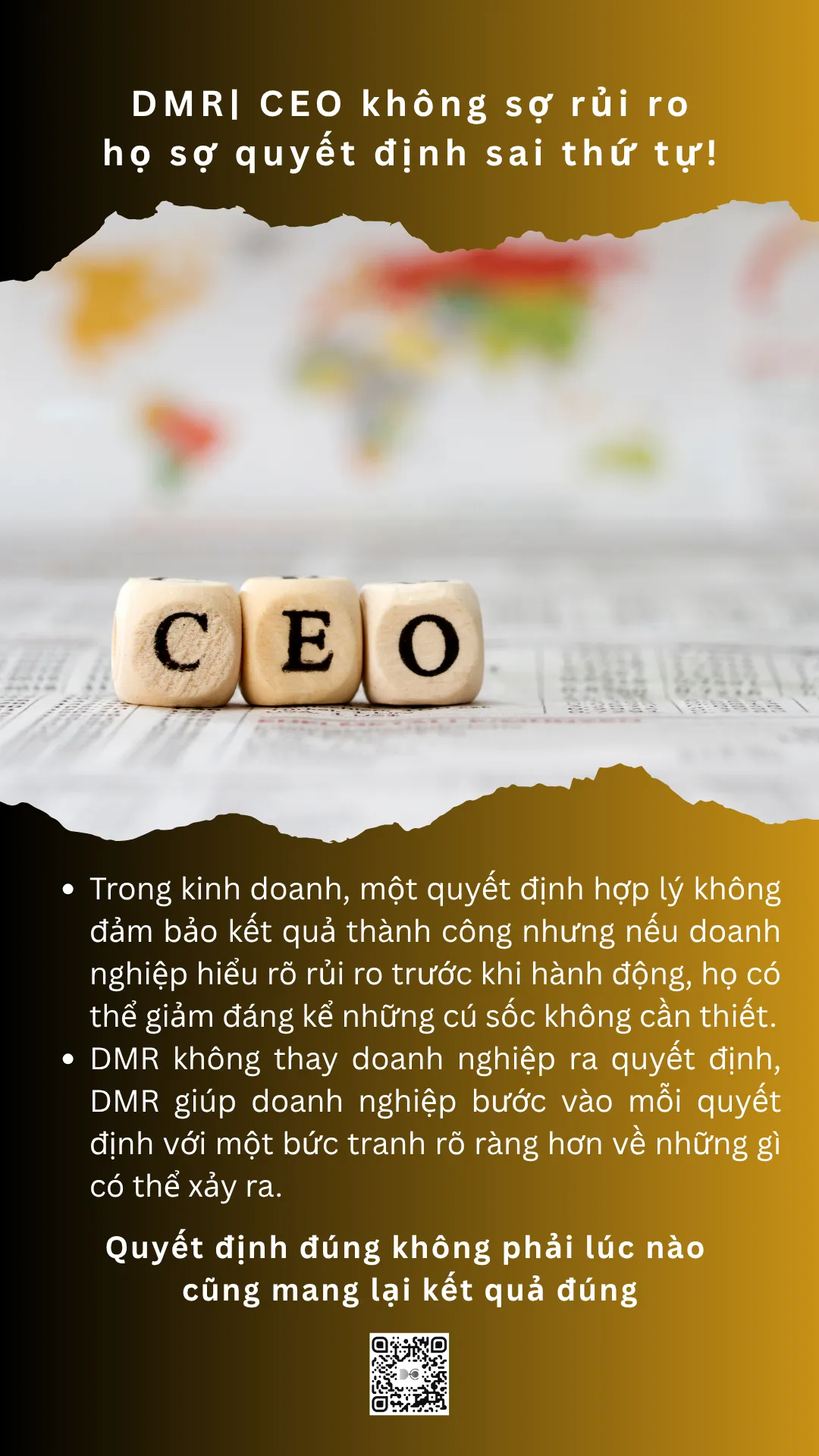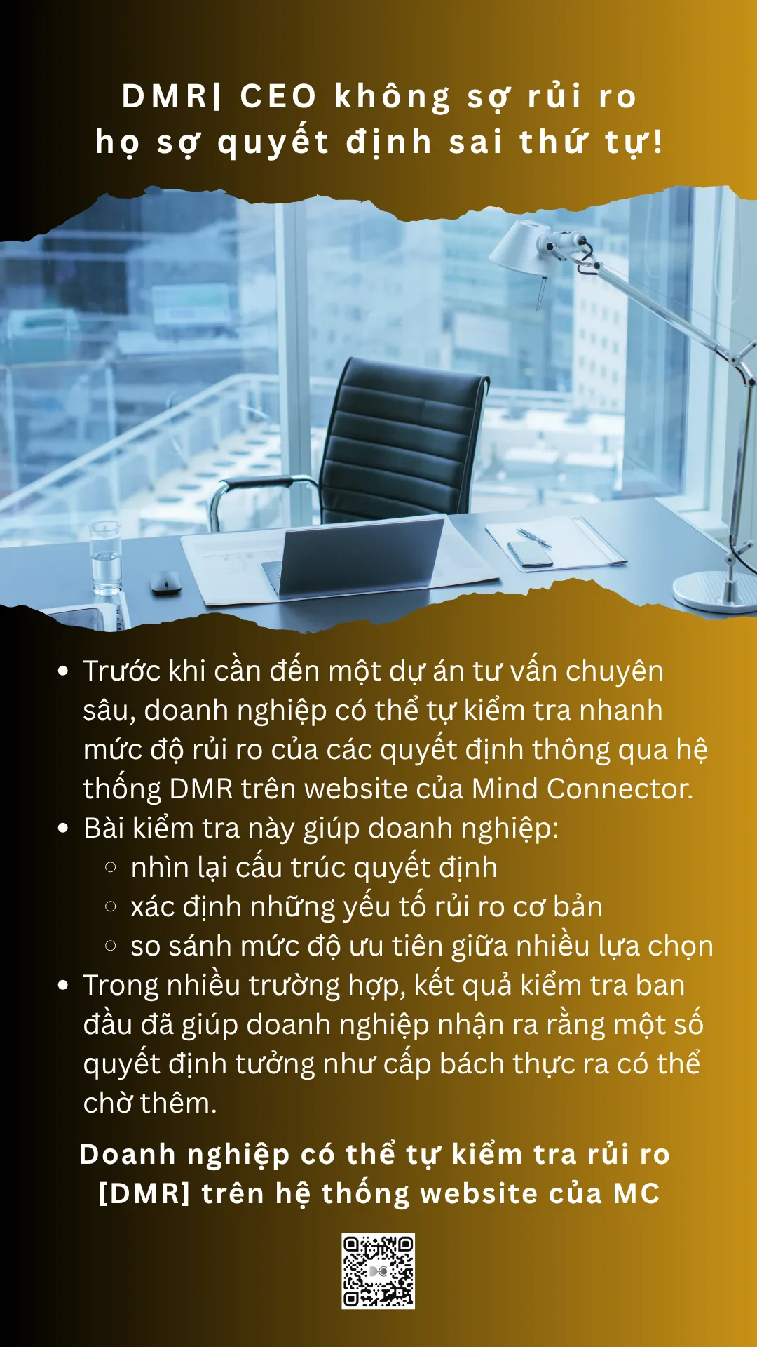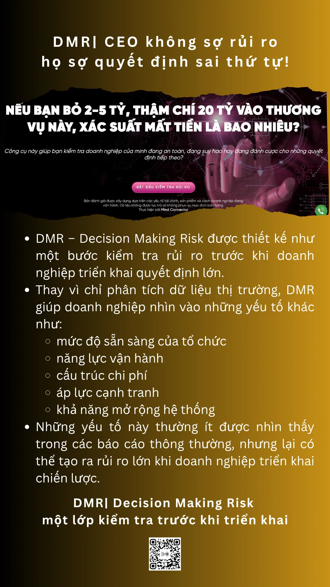These decisions often offer significant growth opportunities but also carry much higher levels of risk. In these cases, Mind Connector experts will step in to conduct in-depth DMR (Decision Risk Assessment), helping businesses evaluate the entire risk structure of the decision.